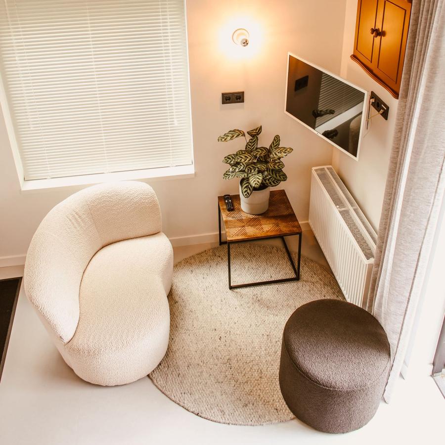 Zo geniet je in PLK1 van je eigen living met eethoek en zitje, een aparte slaapkamer met een gigantisch lekkere Swiss Sense boxspring (en tv!) op de bovenverdieping, een fijne keuken met 4-pits inductie kookplaat, vaatwasser en mini-oven, een aparte koffiecorner (inclusief gratis koffie van de Koffiejongens! En heerlijke thee) en een apart toilet. PLK1 is perfect voor een heerlijk verblijf voor twee personen. Trotse ouders? Dan schuiven we met liefde een babybedje bij.