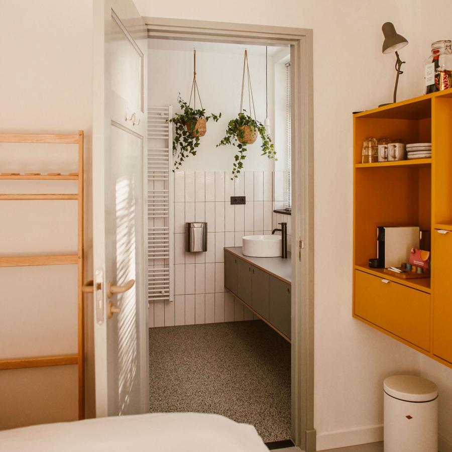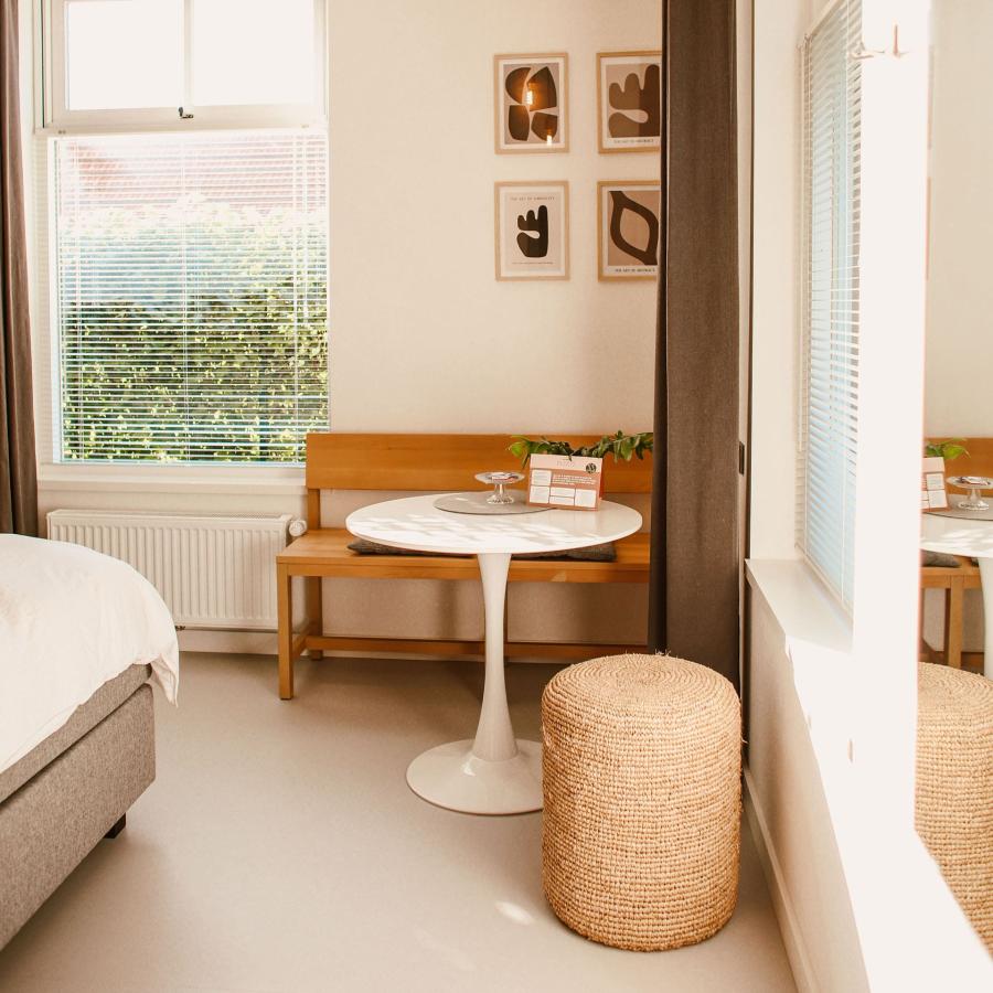 Je vindt de kamer op de begane grond van het hotel. Je hebt er natuurlijk – daar kom je voor! – een heerlijk tweepersoonsbed om op neer te ploffen. Maar ook wacht er je eigen koffiecorner (met gratis koffie van de Koffiejongens! En heerlijke thee) en een luxe badkamer met vloerverwarming, douche en dubbele wastafel. De kamer is voorzien van een airco (nieuw vanaf mrt 2026), dus altijd genieten van de juiste temperatuur. Omdat we dat zelf óók fijn vinden: het toilet is apart.